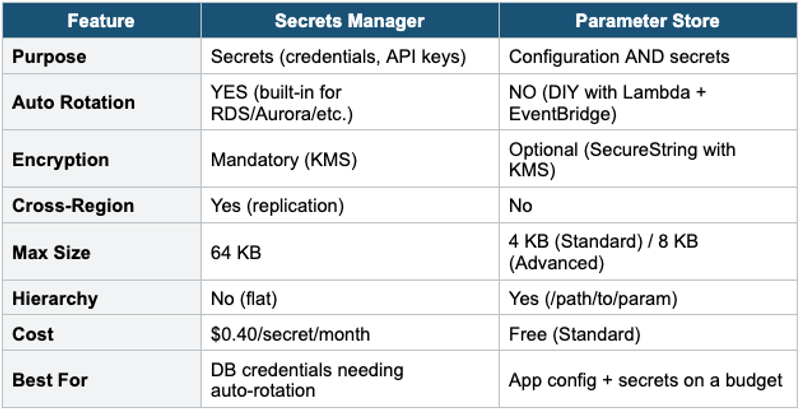 Decision Rule Auto-rotate DB credentials? = Secrets Manager. Hierarchical config + budget? = Parameter Store. Both? = Parameter Store for config, Secrets Manager for rotating secrets.
