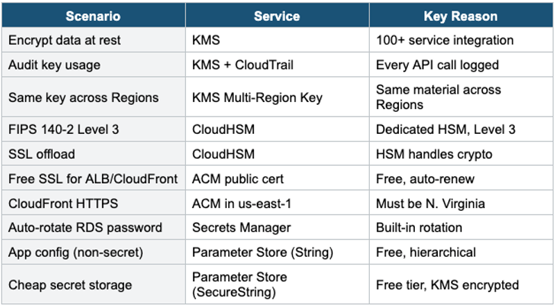 Exam Tip "Audit key usage" = KMS+CloudTrail. "FIPS L3" = CloudHSM. "Free SSL" = ACM. "CF cert" = us-east-1. "Auto-rotate DB" = Secrets Manager. "Config+secrets cheap" = Parameter Store. "Encrypt >4KB" = Envelope Encryption. "Cross-account key" = CMK. "SSL on EC2" = NOT ACM.