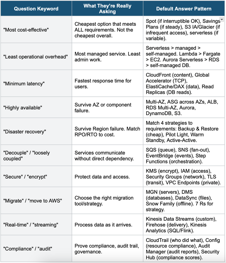 ✓ Identify keywords (cost, HA, serverless, etc.)