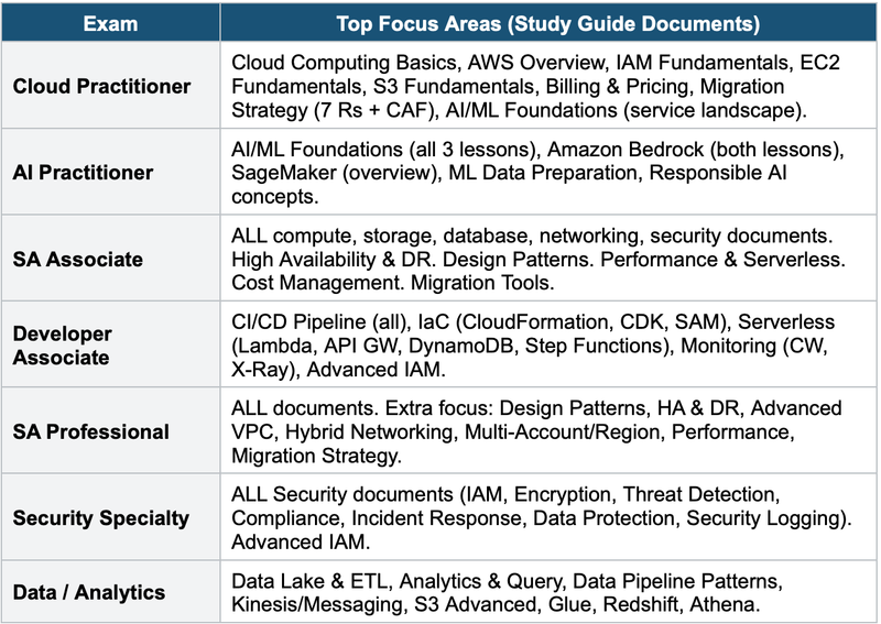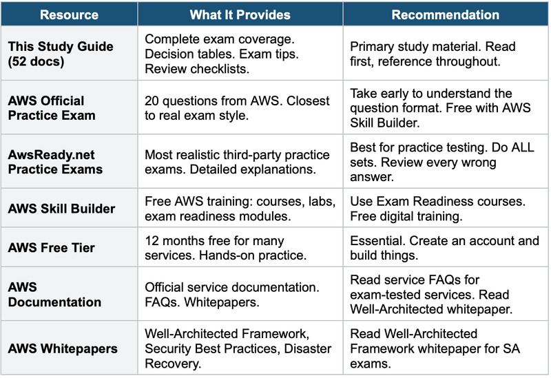 Important WarningPractice exams are the BEST predictor of exam readiness. If you consistently score 80%+ on AWSReady.net or AWS official practice exams, you are likely ready. If scoring below 70%, continue studying weak areas before booking. Do NOT book the exam until you are consistently passing practice tests.Exam TipStudy Strategy: 40% learn, 30% hands-on, 25% practice exams, 5% review. Understand concepts, don’t memorize. Decision tables and comparison tables are the most exam-relevant content. Practice exams: review EVERY wrong answer. Score 80%+ consistently before taking the real exam. Use this study guide’s Final Exam Reminder boxes for last-minute review.