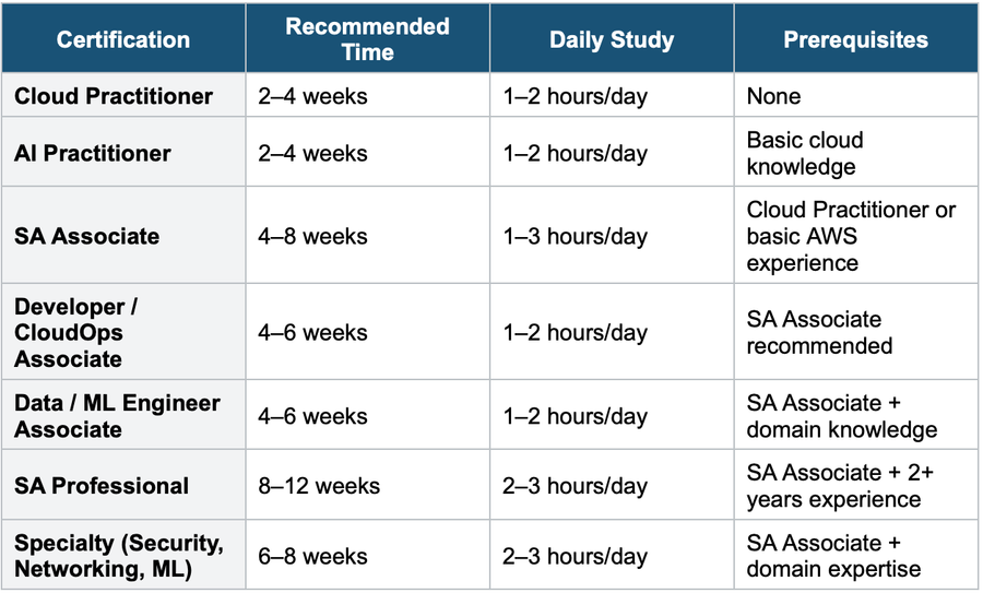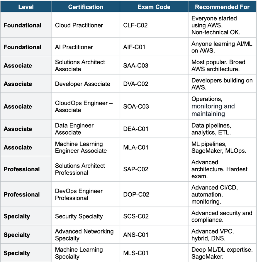 Recommended PathStart: Cloud Practitioner (build foundation). Next: Solutions Architect Associate (most valuable, broadest coverage). Then: specialize based on your role — Developer, CloudOps, Data, ML, or Security. Professional and Specialty exams are advanced — get Associate first.